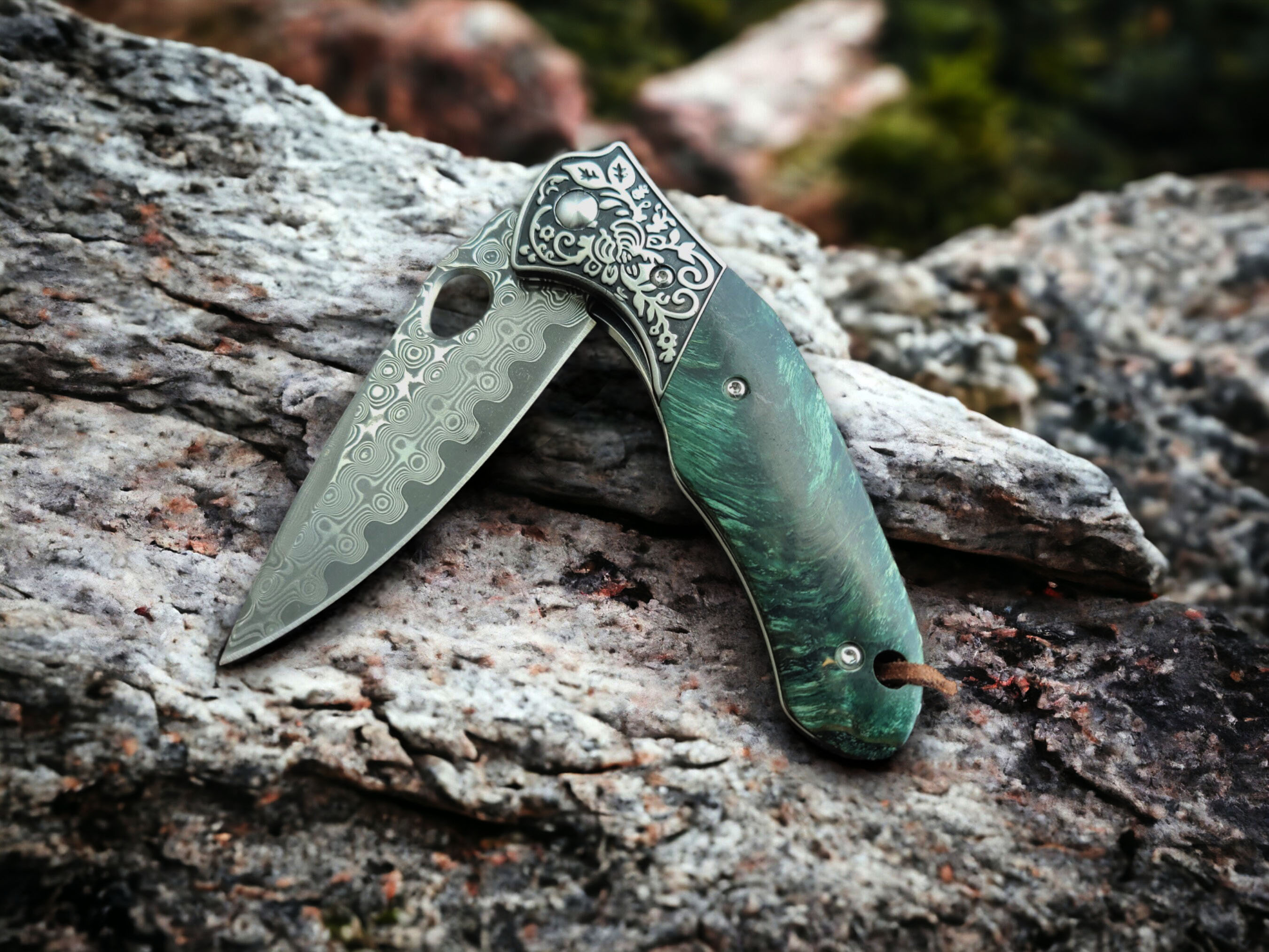 Damascus Engraved Abalone Handle Pocket Knife -EDC