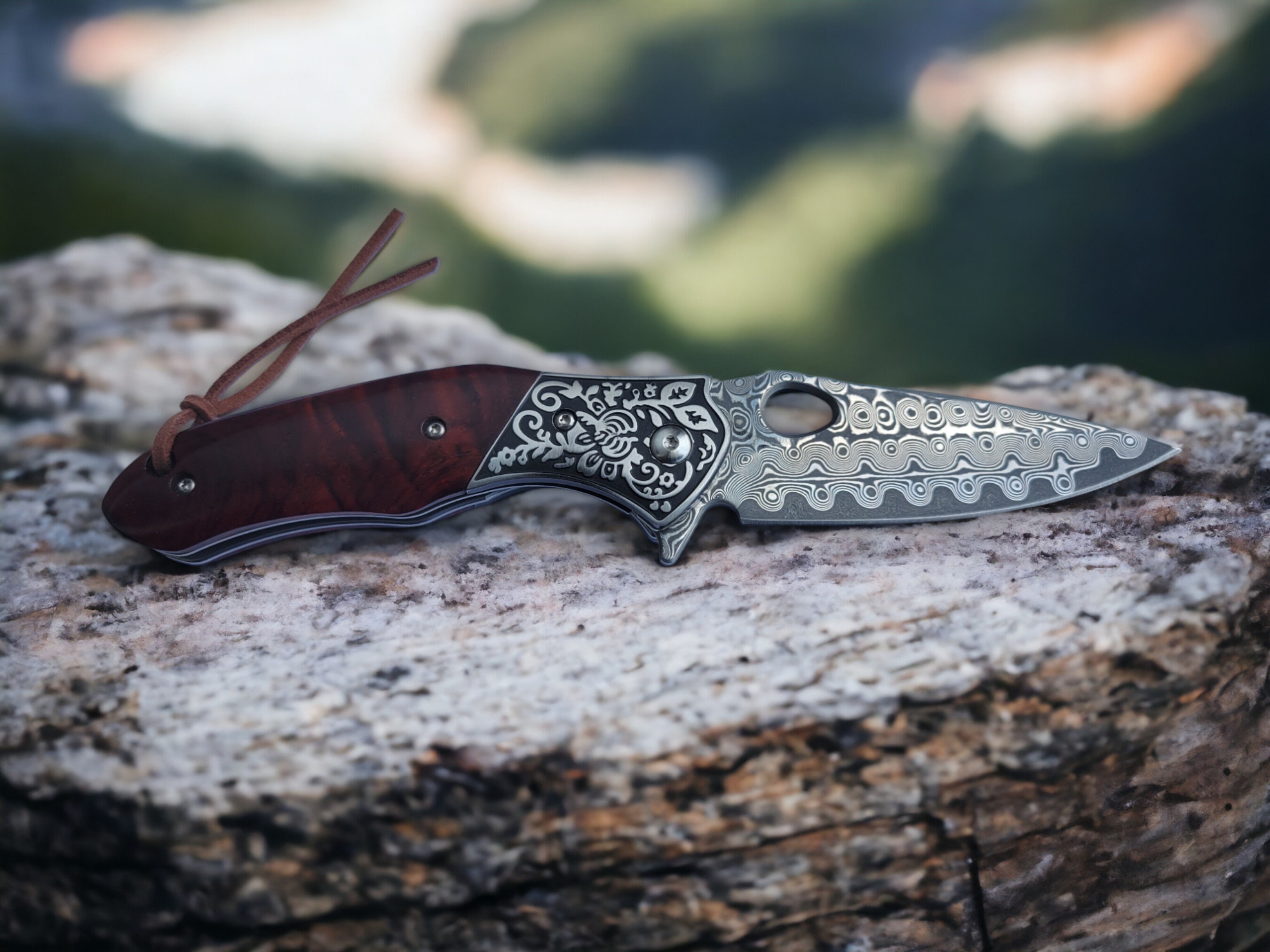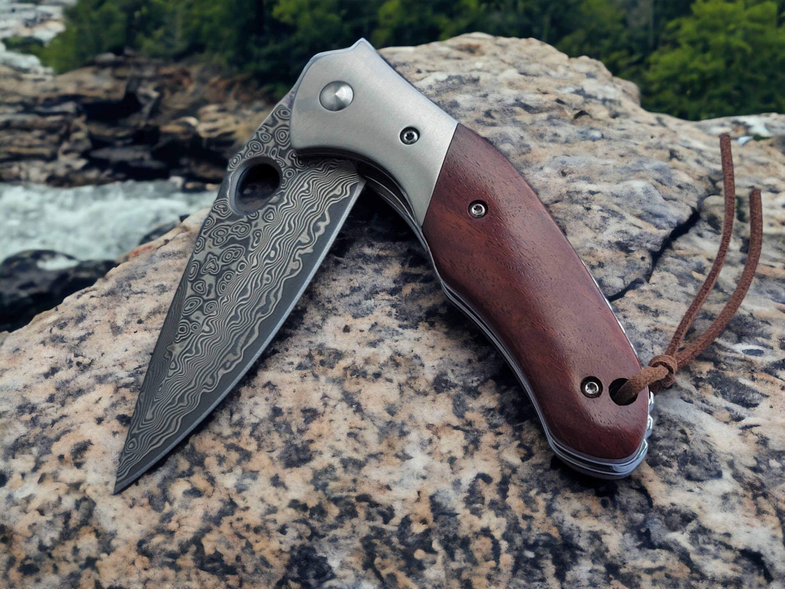 Damascus Steel EDC Pocket Knife With Rose Wood Handle